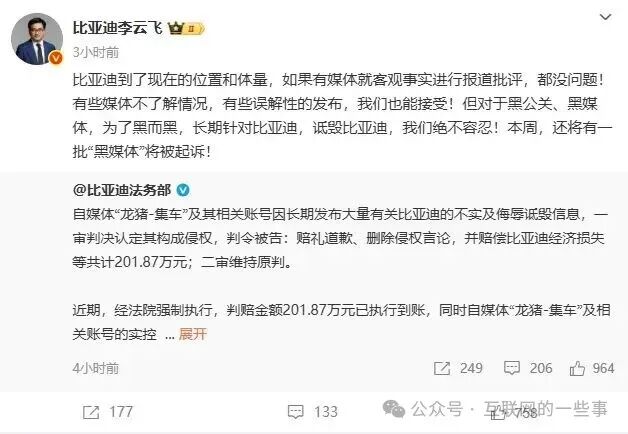 比亚迪品牌及公关处总经理李云飞发文回应称,公司欢迎建设性批评,但绝不容忍“为了黑而黑”的行为。