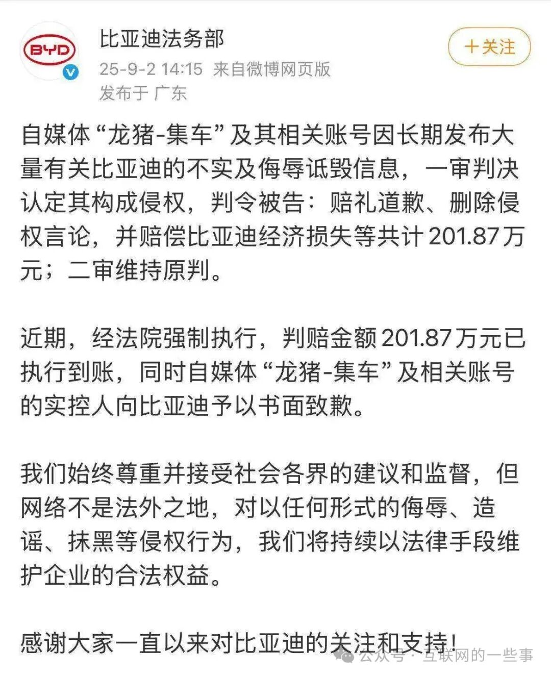9月2日,比亚迪法务部发布消息称,围绕“龙猪-集车”及旗下账号长期发布不实、侮辱性内容的问题,法院已作出终审判决。