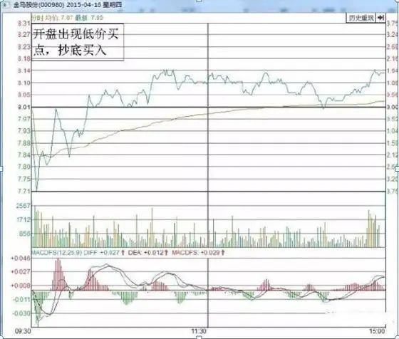 上图是金马股份(000980)的分时图,该股开盘时急剧下跌,最高跌幅至3.75%,是抄底买入的良机,可待尾盘时卖掉前一日买入的股票,完成一个“T+0”的操作过程。