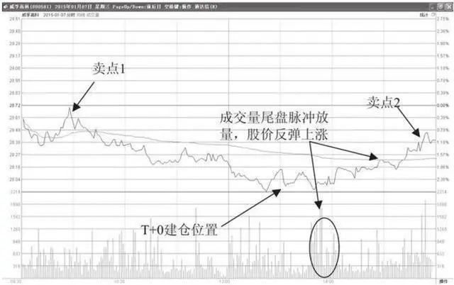 要点2:在股价尾盘脉冲放量的时候,反弹走势出现,那么第二次的高抛机会出现在收盘前。这个时候,虽然股价反弹高度不大,但依然是盘中的高位。因此,尾盘也是第二次做空的机会。如果我们在开盘阶段没能完成T+0的高抛动作,尾盘可以考虑卖出股票。
