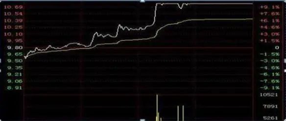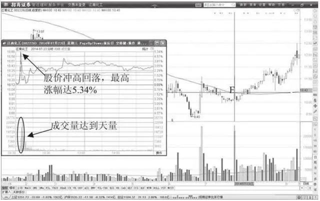 成交量以脉冲形式放大,持续时间必然有限,那么股价上涨的时间也会非常有限。这样一来,我们T+0做空机会出现在很短的时间里。成交量短时间内达到天量的时候,意味着股价达到顶部区域,高抛做空的时机成熟。我们有理由相信,分时图中的冲高回落的做空机会一定出现在股价冲高期间。
