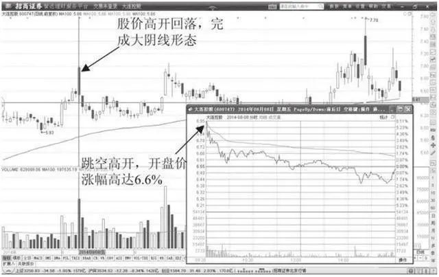 要点2:日K线图中显示,该股在高开以后完成了大阴线的形态。当股价见顶回落的时候,阴线的开盘价格是典型的做空机会。我们可以在T+0交易中把握住卖点,达到超短线的盈利目标。