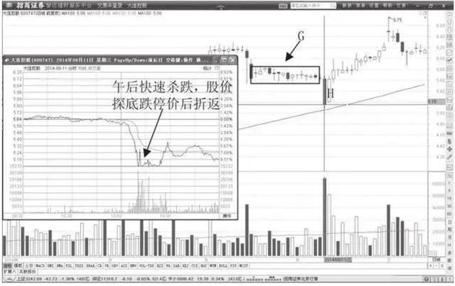要点2:日K线图中显示,该股前期走势显然非常稳定,图中G位置的横向调整中价格波动空间有限。突然出现的大阴线形态,显然是该股异常波动的信号。这样看来,大阴线出现以后该股在图中H位置以大阳线反弹。那么我们在股价超跌期间建仓,自然获得很好的收益。