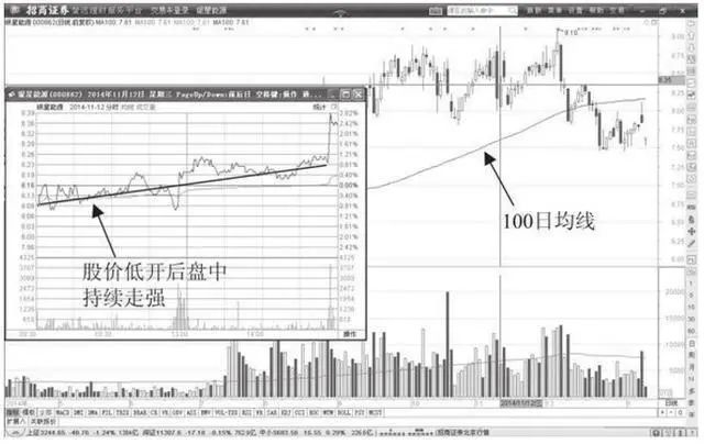 要点2:从日K线图来看,价格处于100日均线上方,价格走势还是非常强的。在股价还未跌破100日均线前,该股分时图中的低开下跌提供了较好的建仓机会。T+0的超短线交易中,我们非常看重这种因为开盘价格跳空低开出现的交易机会。一旦股价反弹走势出现在分时图或者接下来的交易日,那么我们就有机会把握高抛的卖点。