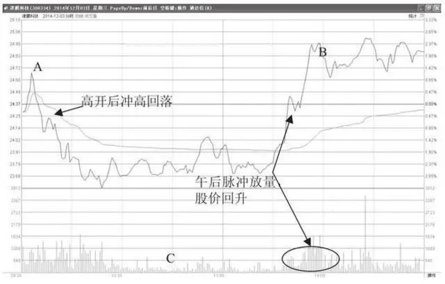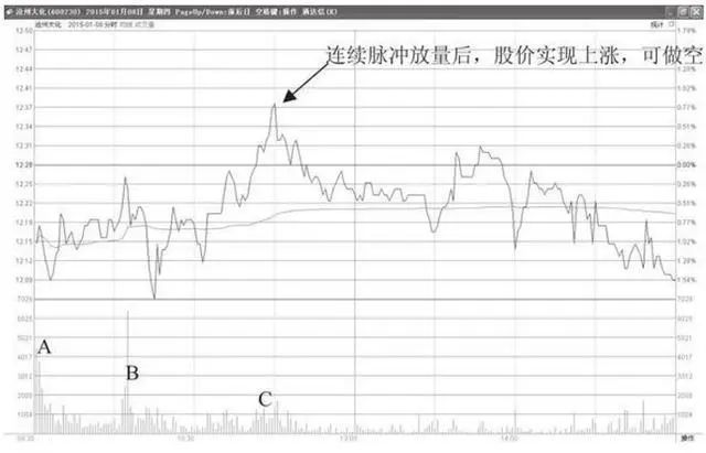 要点1:图显示,开盘价出现跳空回落以后,该股盘中脉冲放量。图中A、B两个位置的脉冲量能非常明显,股价在B位置明显放量回升。而图中的C位置量能维持高位,那么价格短线涨幅接近1%。我们可以考虑在C位置放量的时候股价高位做空,兑现T+0的持股收益。