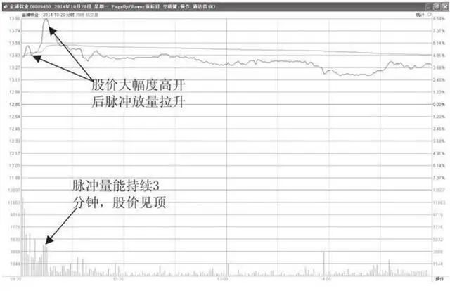 股价大幅度高开以后,如果成交量没能持续放大,那么股价脉冲放量拉升,卖点就出现在股价冲高期间。虽然这种冲高走势持续时间短,股价高开后快速脉冲拉升,短线涨幅较高。一旦我们在价格高位卖出股票,自然在T+0交易中获得非常丰厚的收益。