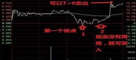 当股价在分时图中出现探底回升走势以后,我们可以考虑开盘阶段和尾盘拉升阶段卖出股票。而T+0的低吸建仓机会,出现在分时图的盘中。股价高开后快速回调的时候,盘中出现探底走势,而尾盘股价继续放量反弹,那么分时图中的第二次卖点出现在尾盘阶段。