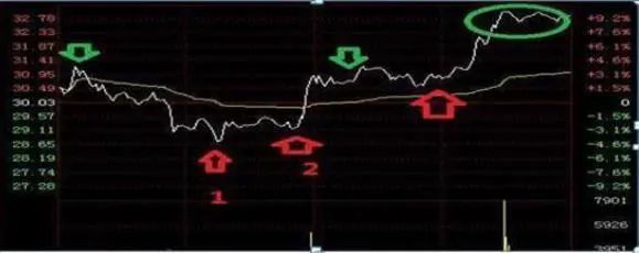 如图,开盘后在低位震荡,但低点在一路抬高,那么在接近翻红时,买点2可以买入股票,后面如直线拉升的话,只要2~3个点以上,就要择机卖出了。假如买2错过机会的,不要追了,等直线拉升6个点左右,不能再往上冲的话,可以考虑吧手中的股票卖掉一点,等它下跌调整时再买进。